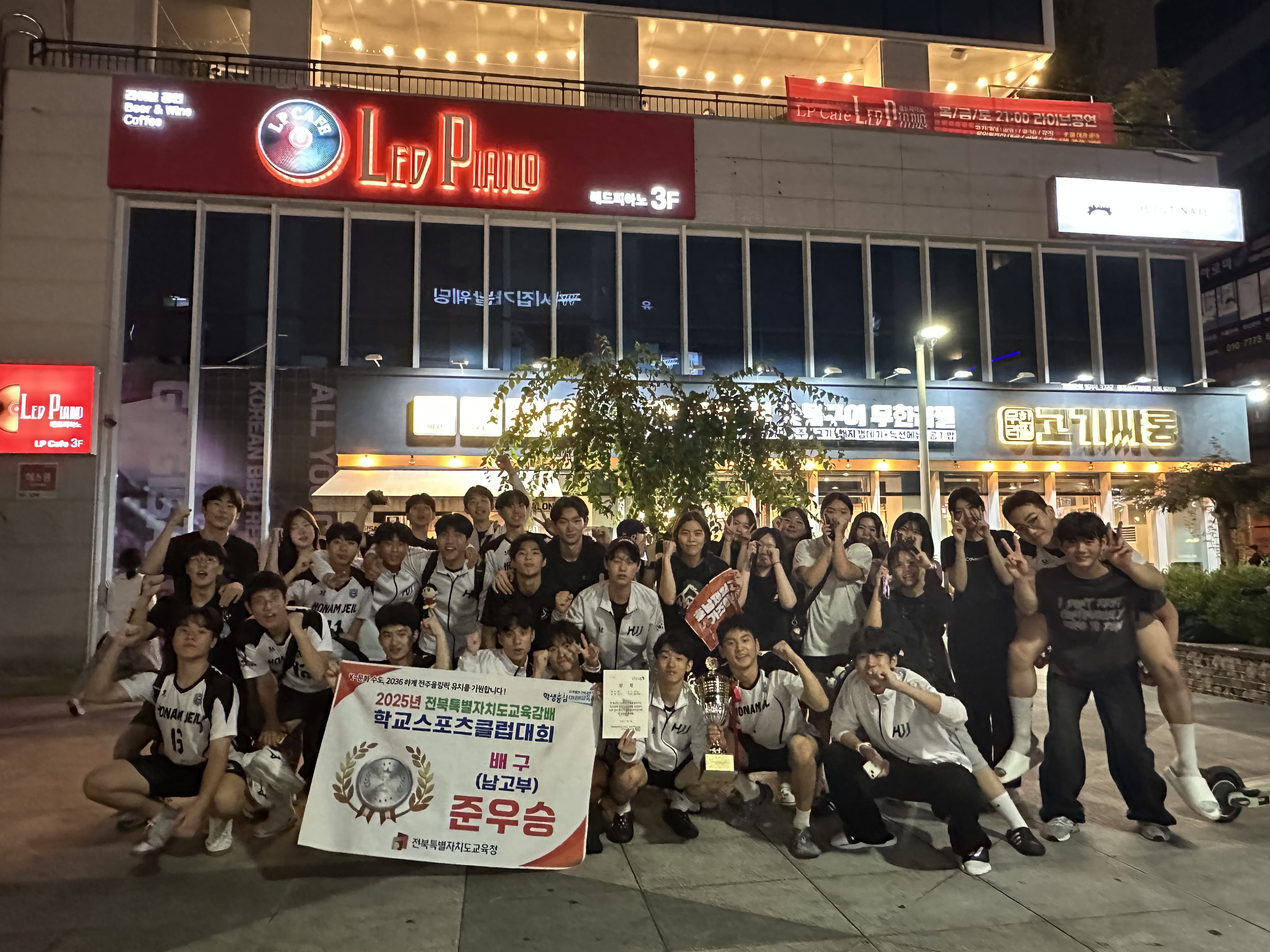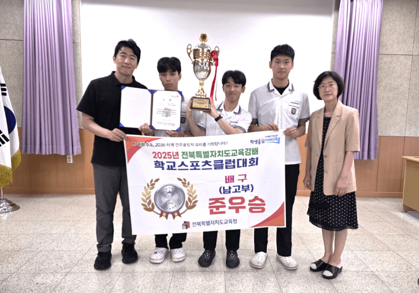 2025년 09월 06일(토), 본교 배구부가 근영중학교 및 근영여자고등학교에서 열린 전북특별자치도 스포츠클럽 배구대회에 참가하여 준우승이라는 값진 성과를 거두었습니다.선수들은 16강 남원고와의 경기에서 2:0 완승을 거두며 힘차게 출발했고, 8강 군산고전에서는 접전 끝에 2:1로 승리를 거두었습니다. 이어진 준결승에서도 군산동고를 상대로 끈질긴 투지와 집중력을 발휘하며 2:1로 승리, 결승에 당당히 올랐습니다. 마지막 순창고와의 결승전에서는 아쉽게 패했지만, 끝까지 포기하지 않고 최선을 다하는 모습은 관중들에게 깊은 울림을 주었습니다. 이번 대회는 단순한 성적 이상의 의미가 있습니다. 학생들은 매일 이어진 훈련 속에서 흘린 땀방울을 경기장에서 꽃피웠고, 서로를 격려하며 하나 된 힘으로 코트를 누볐습니다. 또한 보이지 않는 곳에서 묵묵히 선수들을 지도하고 뒷바라지해주신 담당 선생님의 노고가 있었기에 이러한 성과가 가능했습니다. 또한 대회 당일에는 본교의 많은 선생님들이 경기장을 직접 찾아 학생들을 위해 열정적인 응원을 해주었습니다.